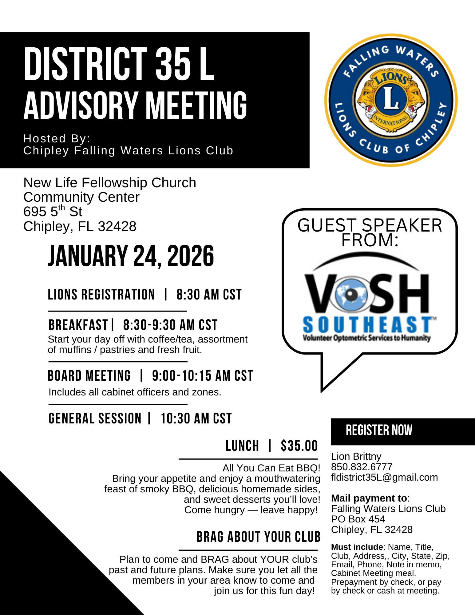 District 35L of Lions Clubs International brings together clubs across North Florida to serve their communities with compassion, fellowship, and purpose. Our district provides the structure to support Lions in living out our mission—fostering understanding among people, promoting good citizenship, caring for the civic and cultural life of our communities, and encouraging service without personal gain. We unite members through friendship and shared values, creating a space for open discussion and collaboration while staying nonpartisan and inclusive. District L proudly includes these counties; Alachua, Baker, Bay, Bradford, Calhoun, Clay, Columbia, Dixie, Duval, Escambia, Franklin, Gadsden, Gilchrist, Gulf, Hamilton, Holmes, Jackson, Jefferson, Lafayette, Leon, Liberty, Madison, Marion, Nassau, Okaloosa, Putnam, Santa Rosa, St. Johns, Suwannee, Taylor, Union, Wakulla, Walton, and Washington Counties—all working together to make a difference in the lives of others.
